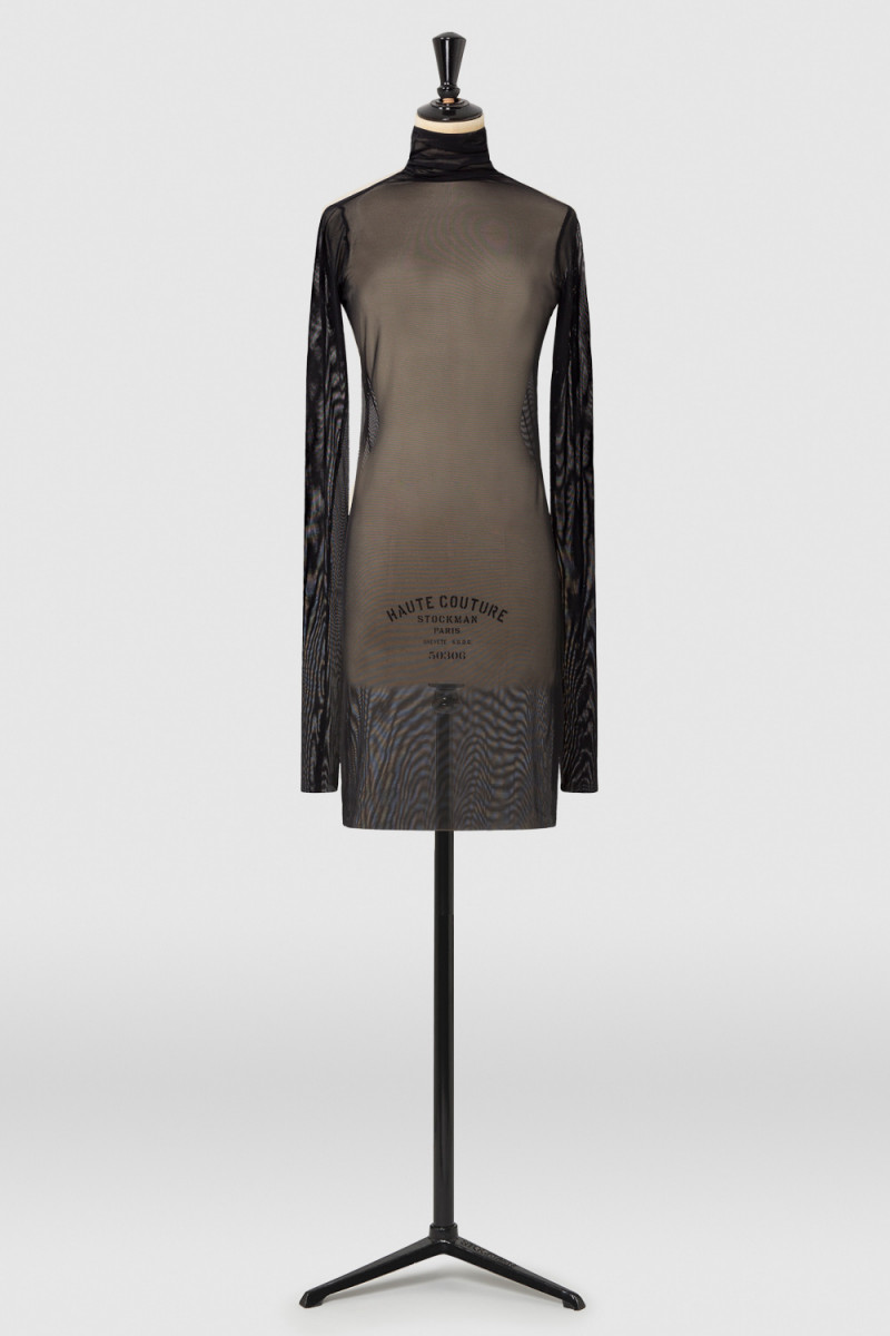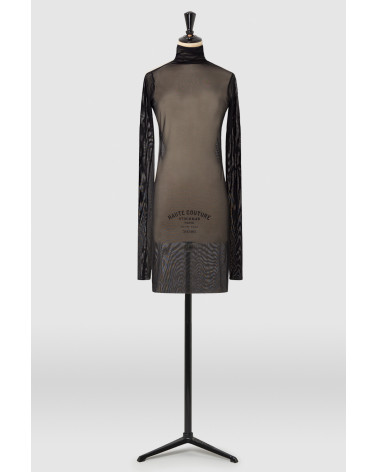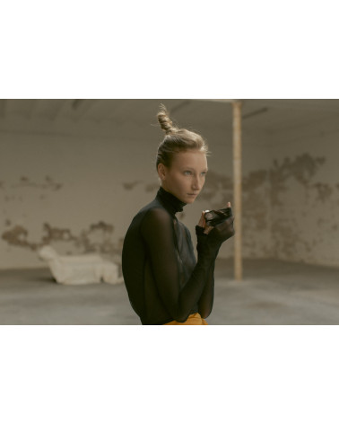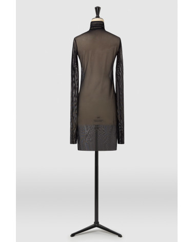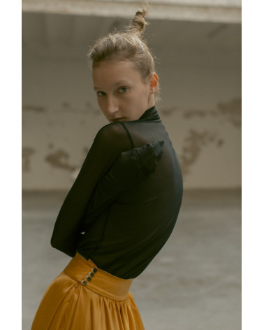 Delicate turtle neck top in stretch tulle to be worn as a second skin. Long sleeves for gathered effect and raw hem finish.