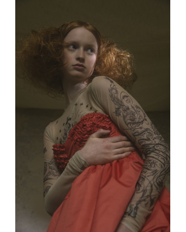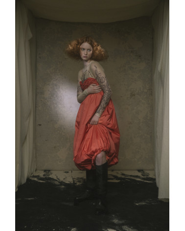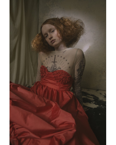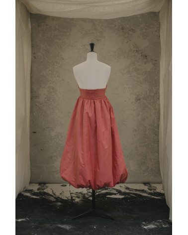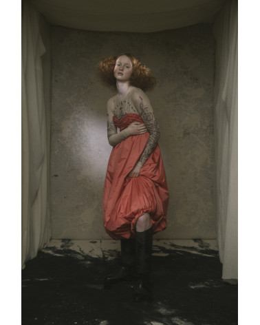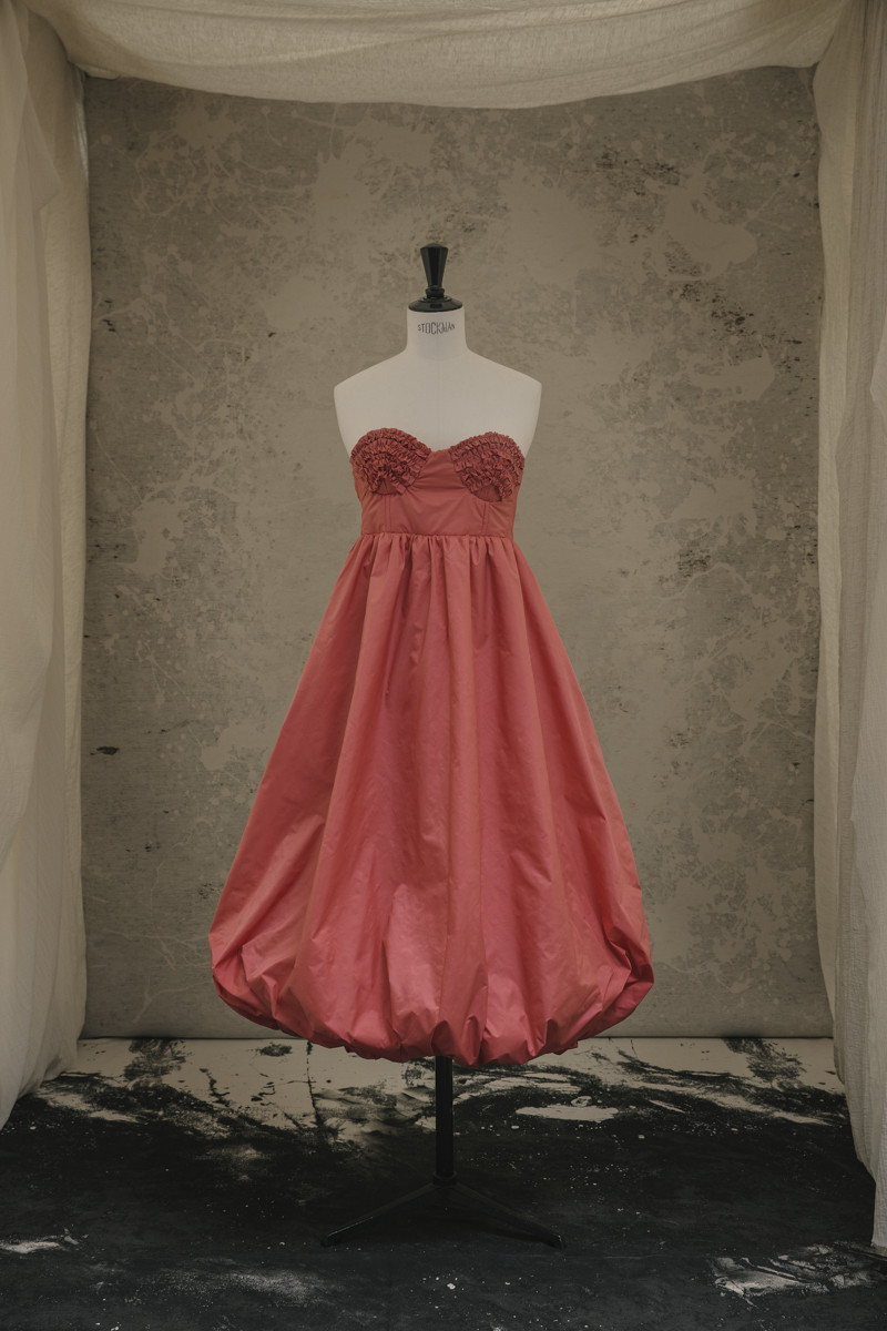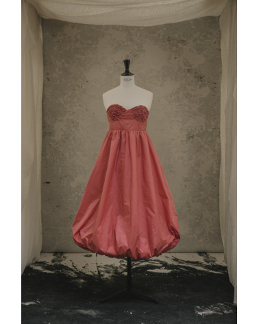 This corset dress in shiny padded rose fabric brims with emotion. Wonderful flounce details on the breast with side pockets. Zip fastener and elasticated detail at the back.