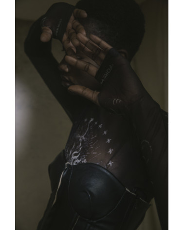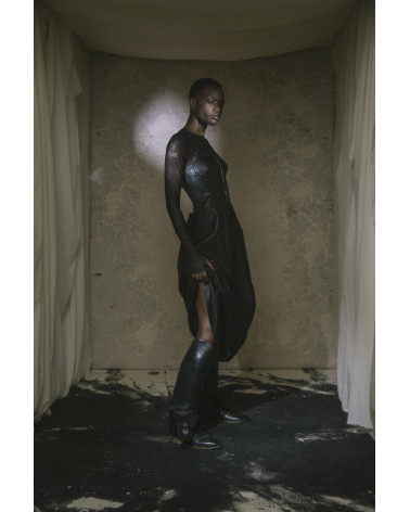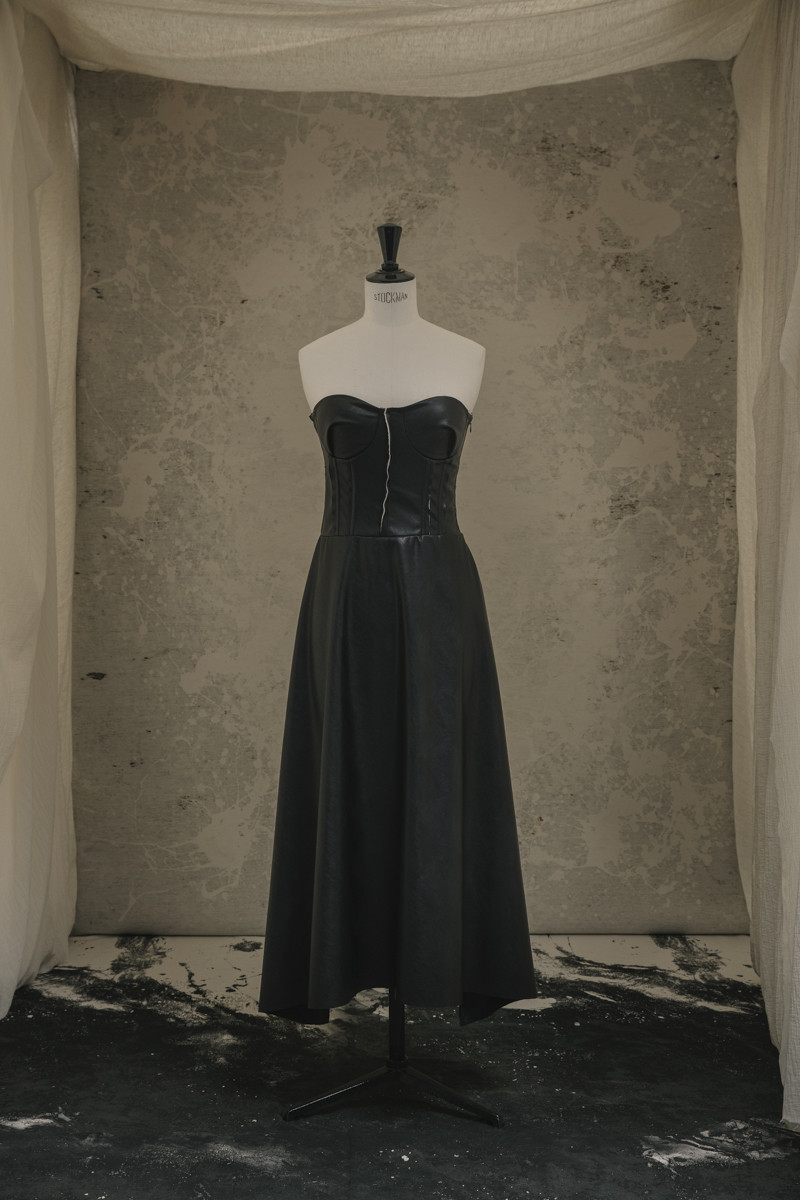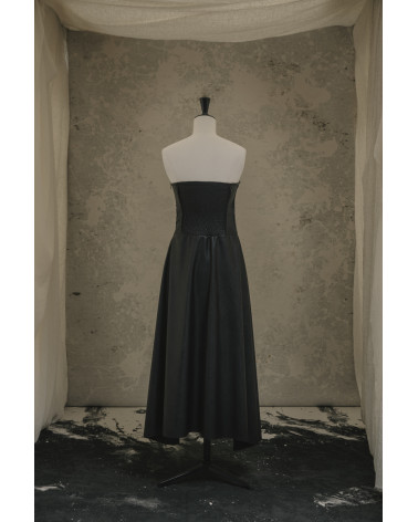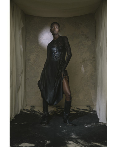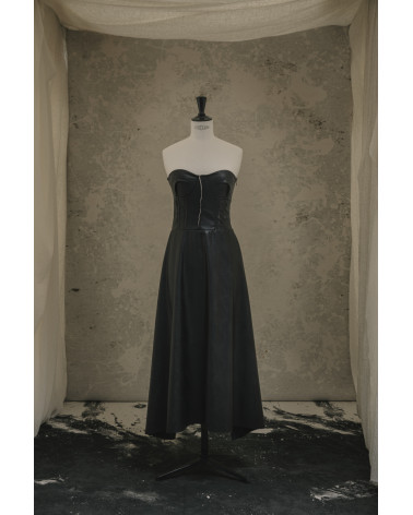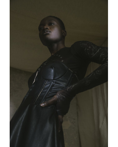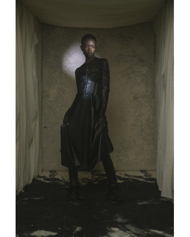 Step out with sense and sensibilty in this divine flared corset dress in recycled soft leather and a stretch tulle skin coloured lining. Step out strong in this Zip fastener on the back and side pockets.