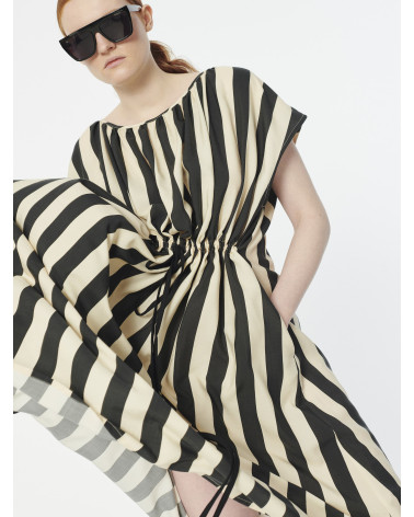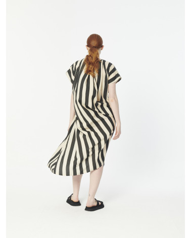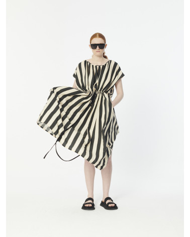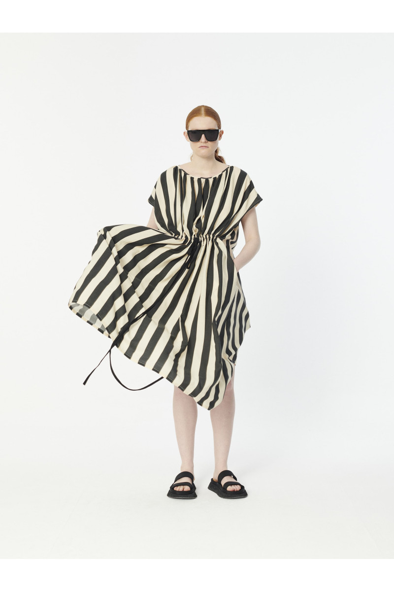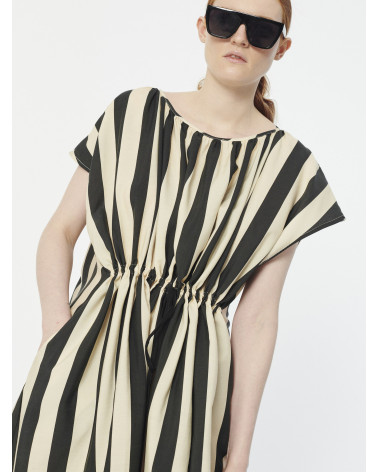 Tunic sleevless Dress featured in a soft cotton fabric with a two-tones kodak stripes print. Designed in a relaxed silhouette to give more comfort and freshness, with tied adjustable waist, and gathered shoulders. Has two seam side pockets.
