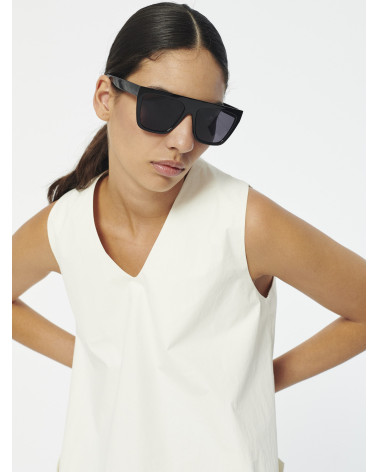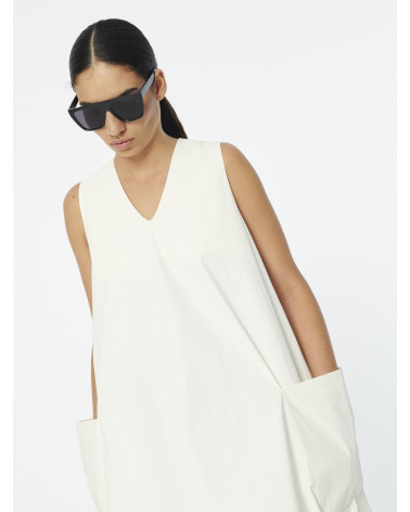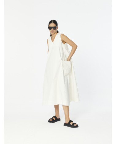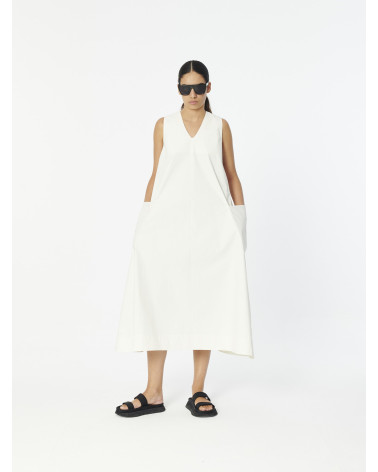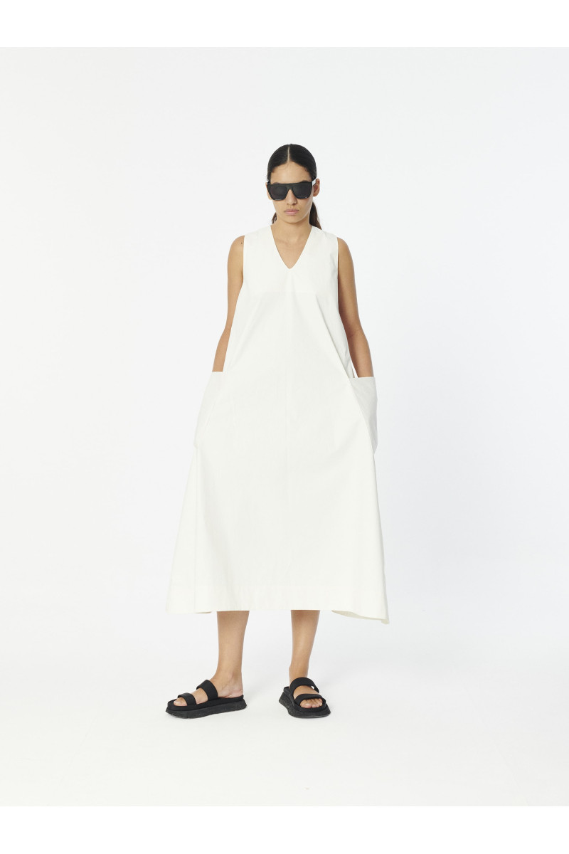 Smart minimal v-neck midi lenght dress crafted from a lightweight, water-repellent cotton fabric. It features two patch pockets.