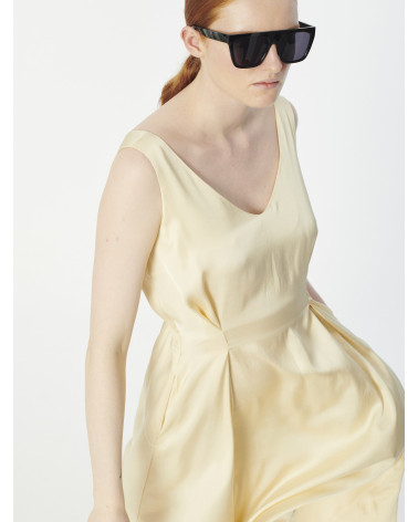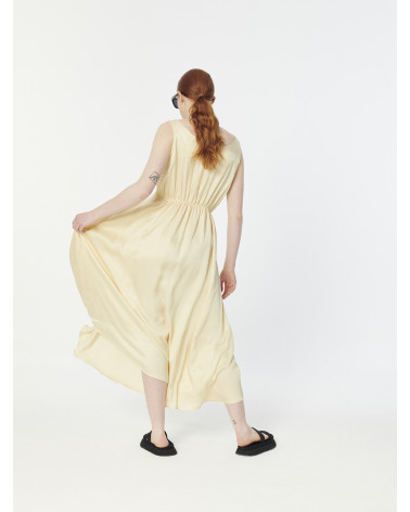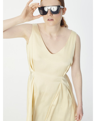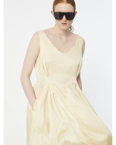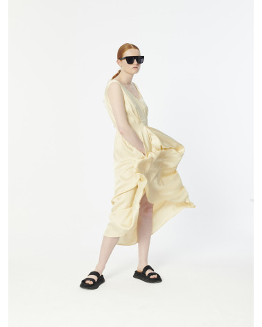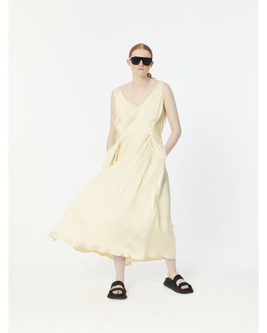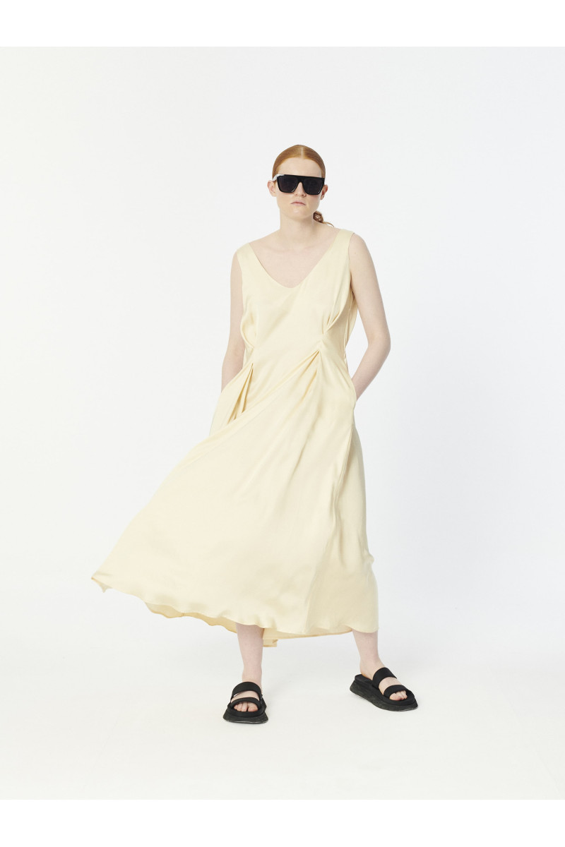 Elegant flowy midi satin spellbound sleeveless v-neck dress. It nips in with two pleats on the waist in front and a thin elastic at the back.