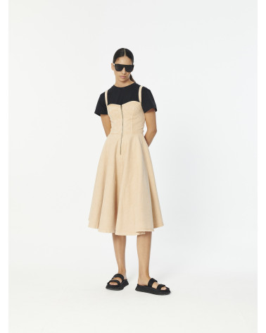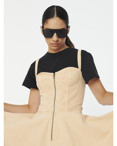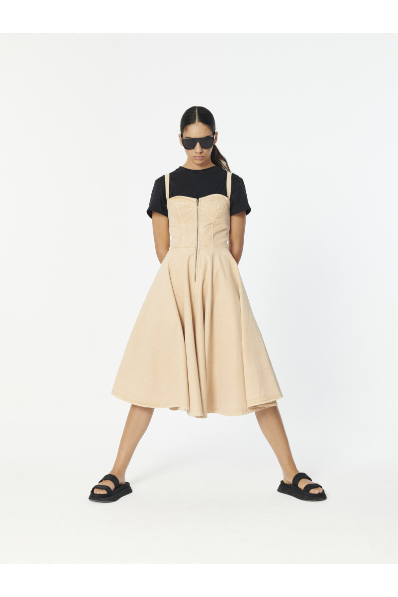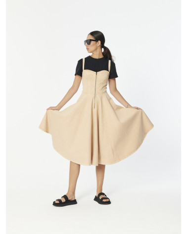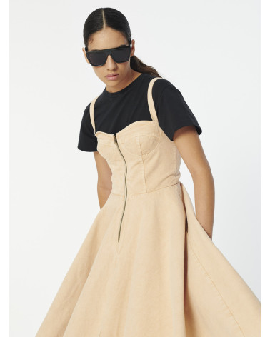 Denim sleeveless Corset Dress crafted in a soft wash-dyed cotton twill fabric. Designed with front zip closure and a voluminous skirt, it has two concealed seam pockets and elastic at the back for more comfort.