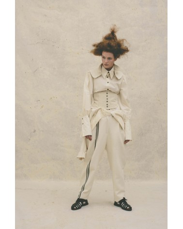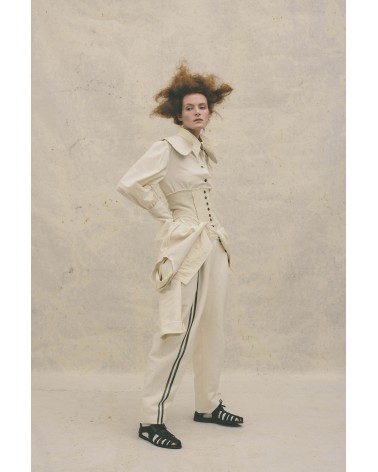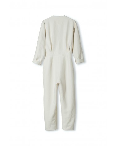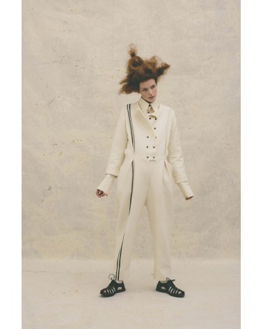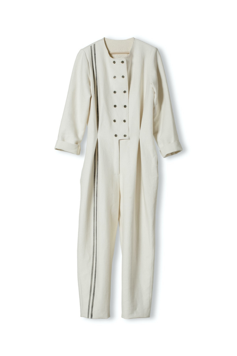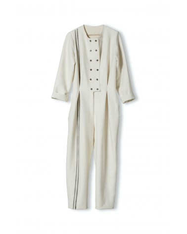 Long jumpsuit with pleats at the front and back. Soft, double-sided cotton fabric with signature black stripe detail. Round neck and bronze buttons that fasten across the body. Transparent thread finish for a raw hem effect.