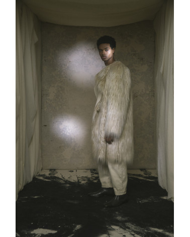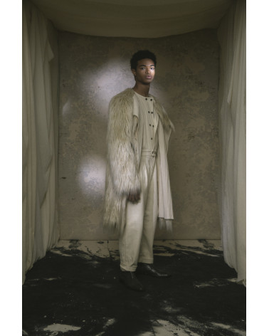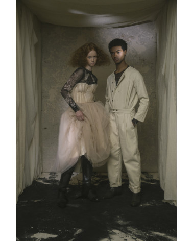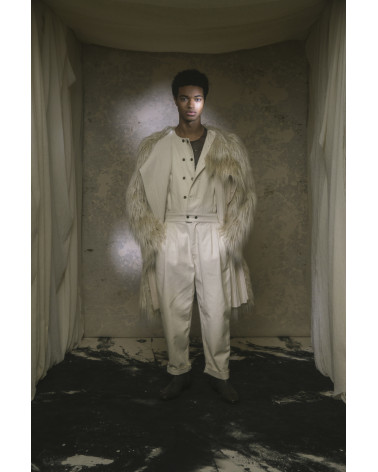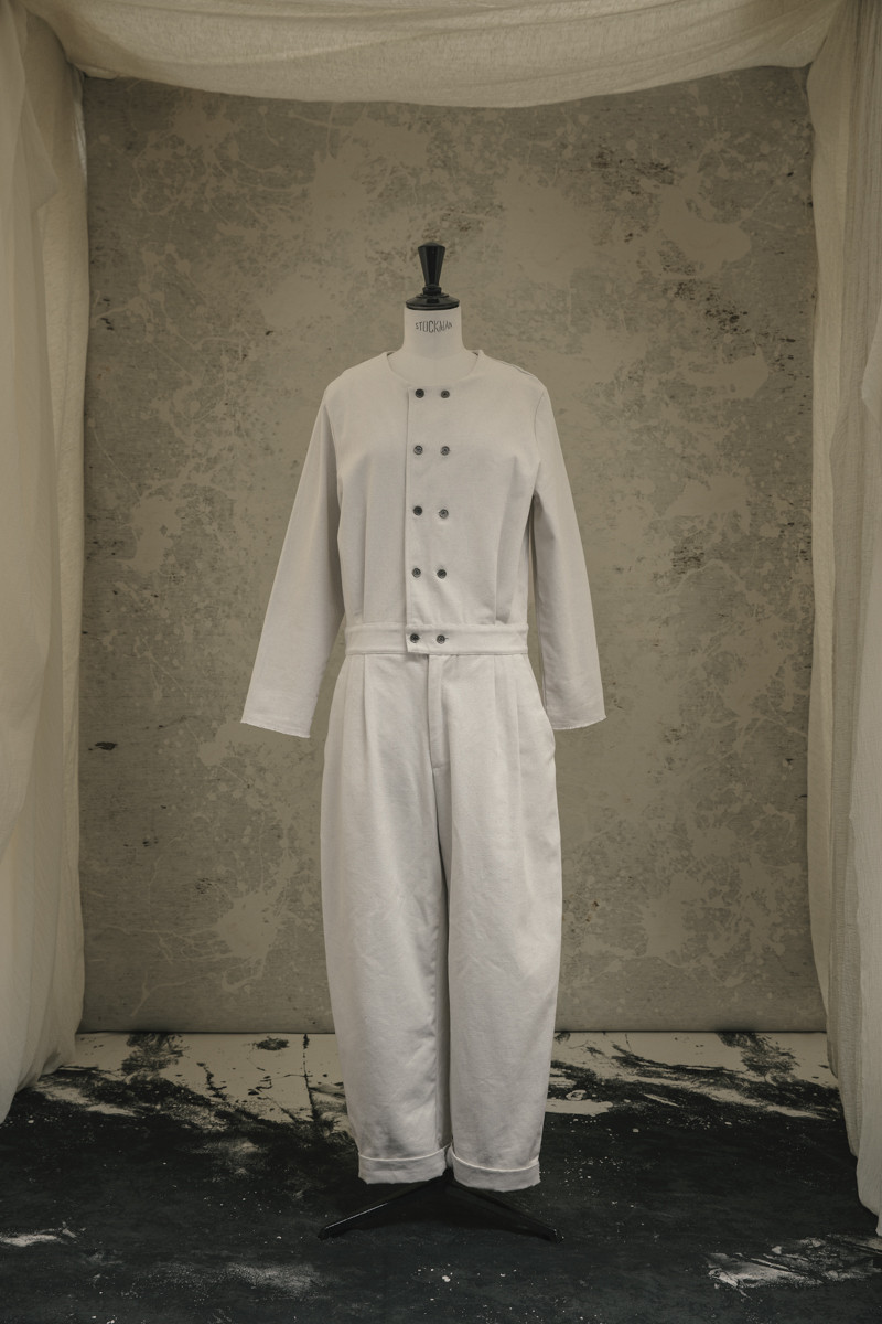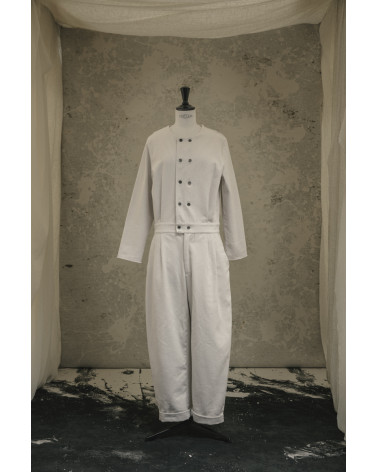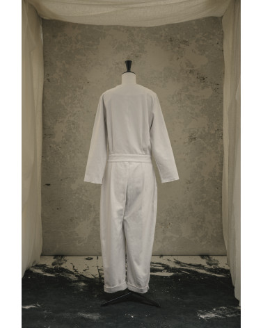 Oversize jumpsuit in organic cotton canvas with exclusive brushstroke print by artist Lidia Masllorens. Lovely bronze button on the cuffs and down the front with side pockets.