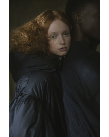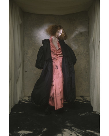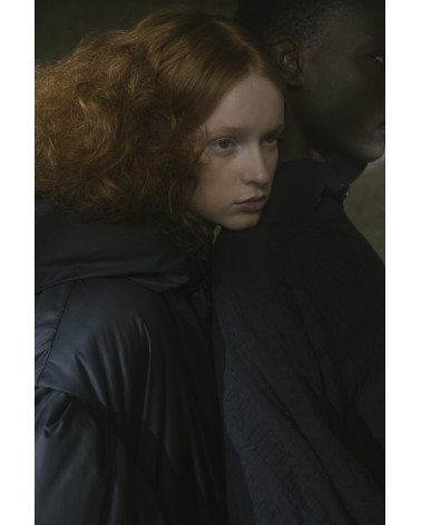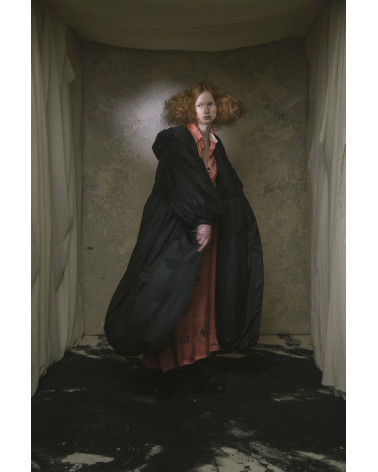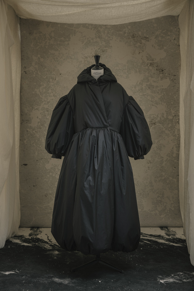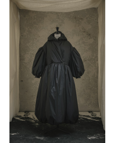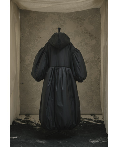 Wear your attitude in this magnificent shiny black, oversize padded nylon coat. Drawn in at the waist with a gently gathered maxi skirt and large side pockets, this piece stands out for its statement balloon sleeves and beautiful diagonal closure with hook fasteners.