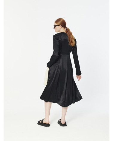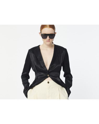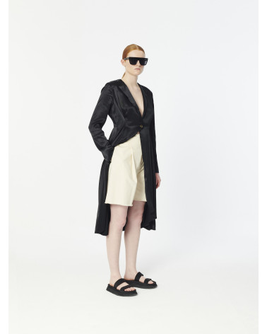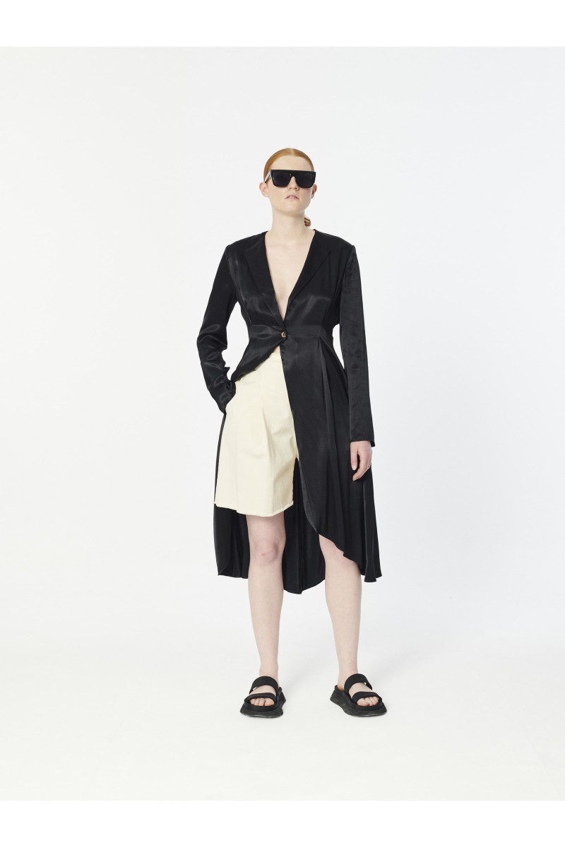 Stunning flowy satin spellbound collarless Long Blazer with a magnificent tulle Skirt that gives volume to the jacket. Designed with two pleats on the waist in front and back to enhance the body. Front fastening with a bronzed button and small inside buttons at the waist to insert the skirt. The two pieces can be worn together or separately.