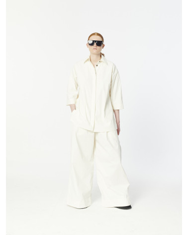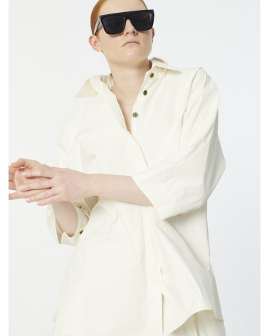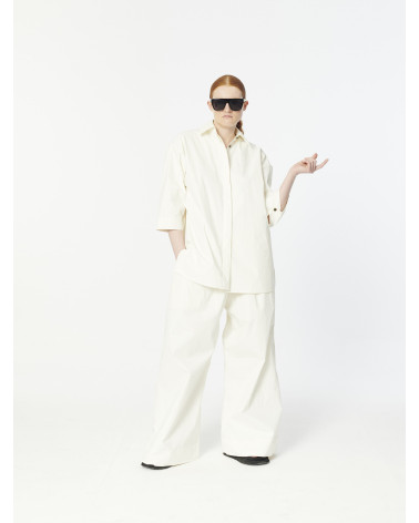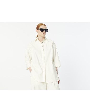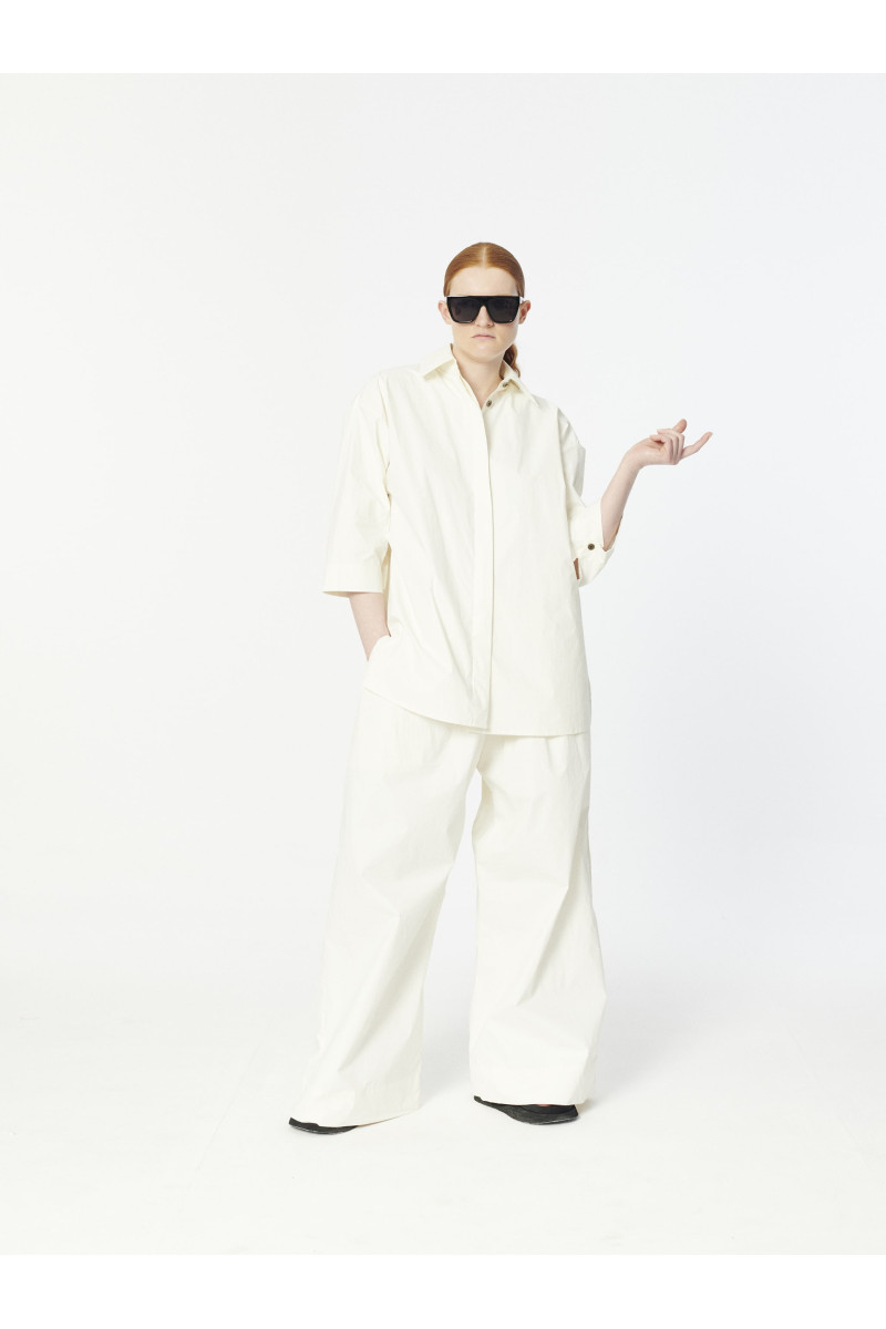 Minimal short sleeve shirt featured in a lightweight, water-repellent cotton fabric. Unisex silhouette with oversize fit detailed with a classic pointed collar and concealed front fastening with bronze buttons.