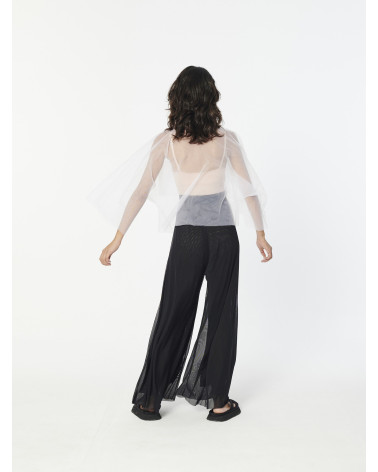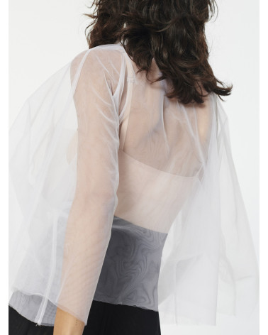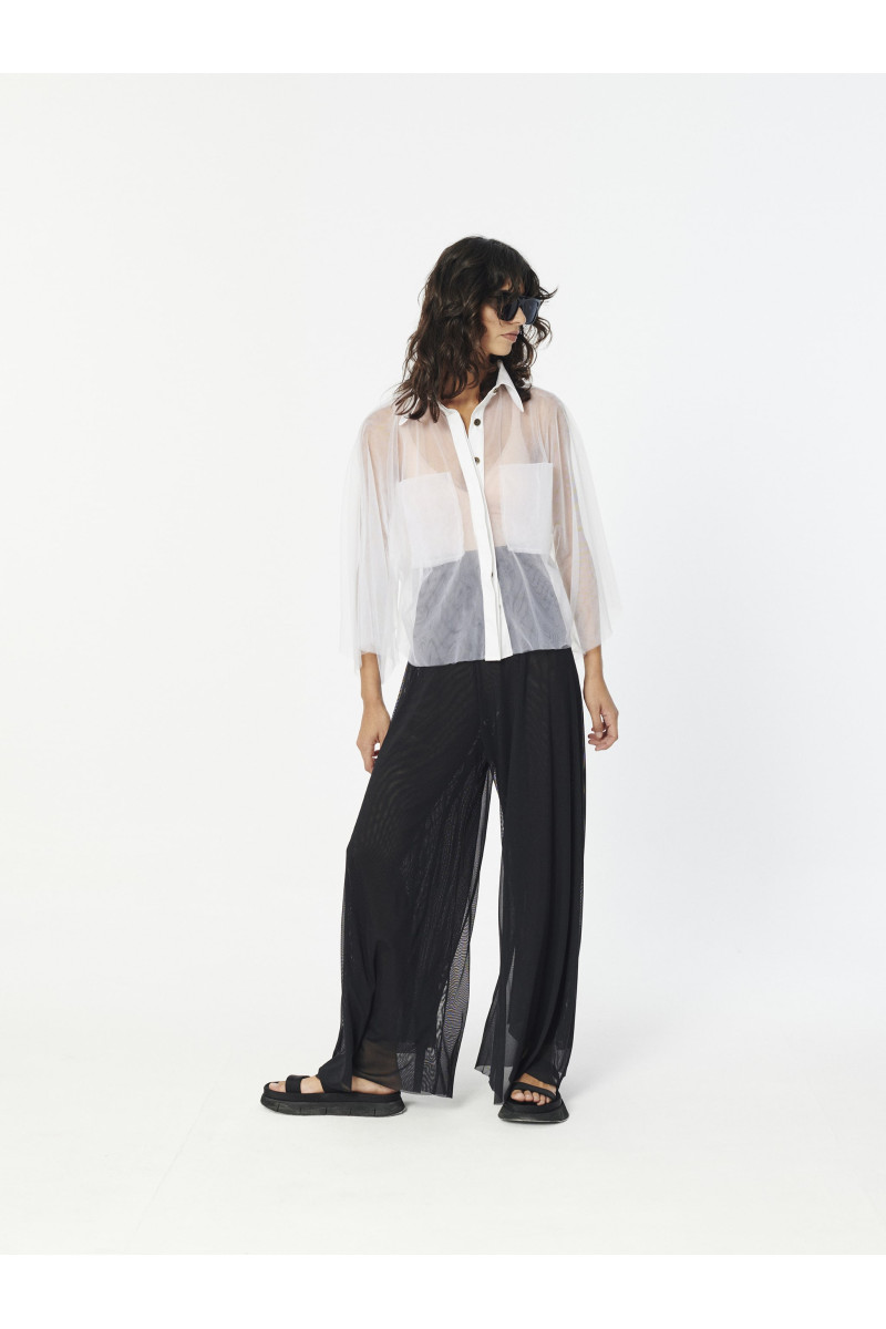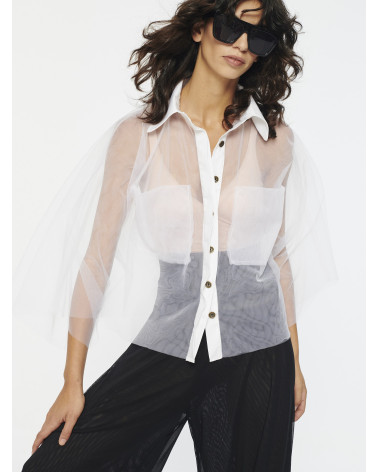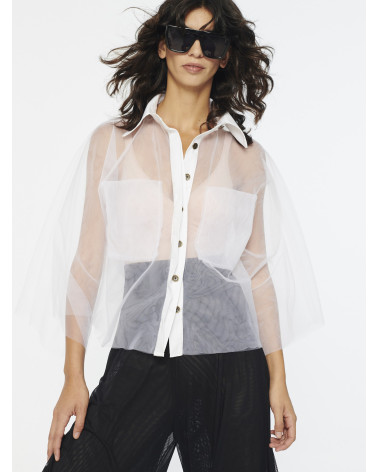 Boxy Shirt featured in a double layer of soft tulle fabric. Designed with a stunning bat-sleeves and two front patch pockets. The Classic pointed collar and the central placket are crafted in a soft cotton contrasting with the transparency of the garment. Concealed bronze buttons closure at the front.